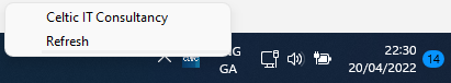 Right clicking over the icon will display 2 menu options. Selecting on the "Celtic IT Consultancy" will redirect you to our website. Selecting on "Refresh" will make the agent checkin to our portal.